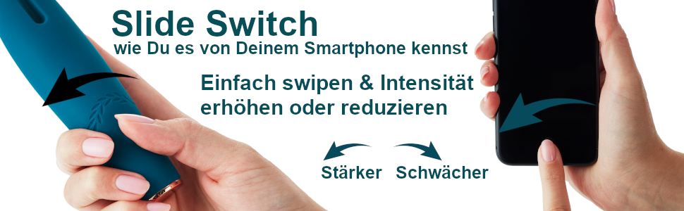 Der Clou: der innovative Slide Switch des Freudenteufels. Jedes seiner fünf Vibrationsmuster lässt sich darüber in drei verschiedenen Stärken variieren. Einfach auf dem mit Print gekennzeichneten Slide Switch nach rechts wischen und sich auf Wolke sieben katapultieren. Nach links wischen und kurz durchatmen, um das Vergnügen noch etwas zu verlängern. |