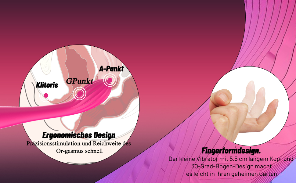 - Fingerähnliches Design für einfaches Einführen: Das ergonomische Kurvendesign ist leicht in die Vagina einzuführen, der schmale Hals neckt die Klitoris oder den G-Punkt wie ein flexibler Finger. Perfekt für Solospiel, Vorspiel oder als aufregendes Sexspielzeug zum Sex.