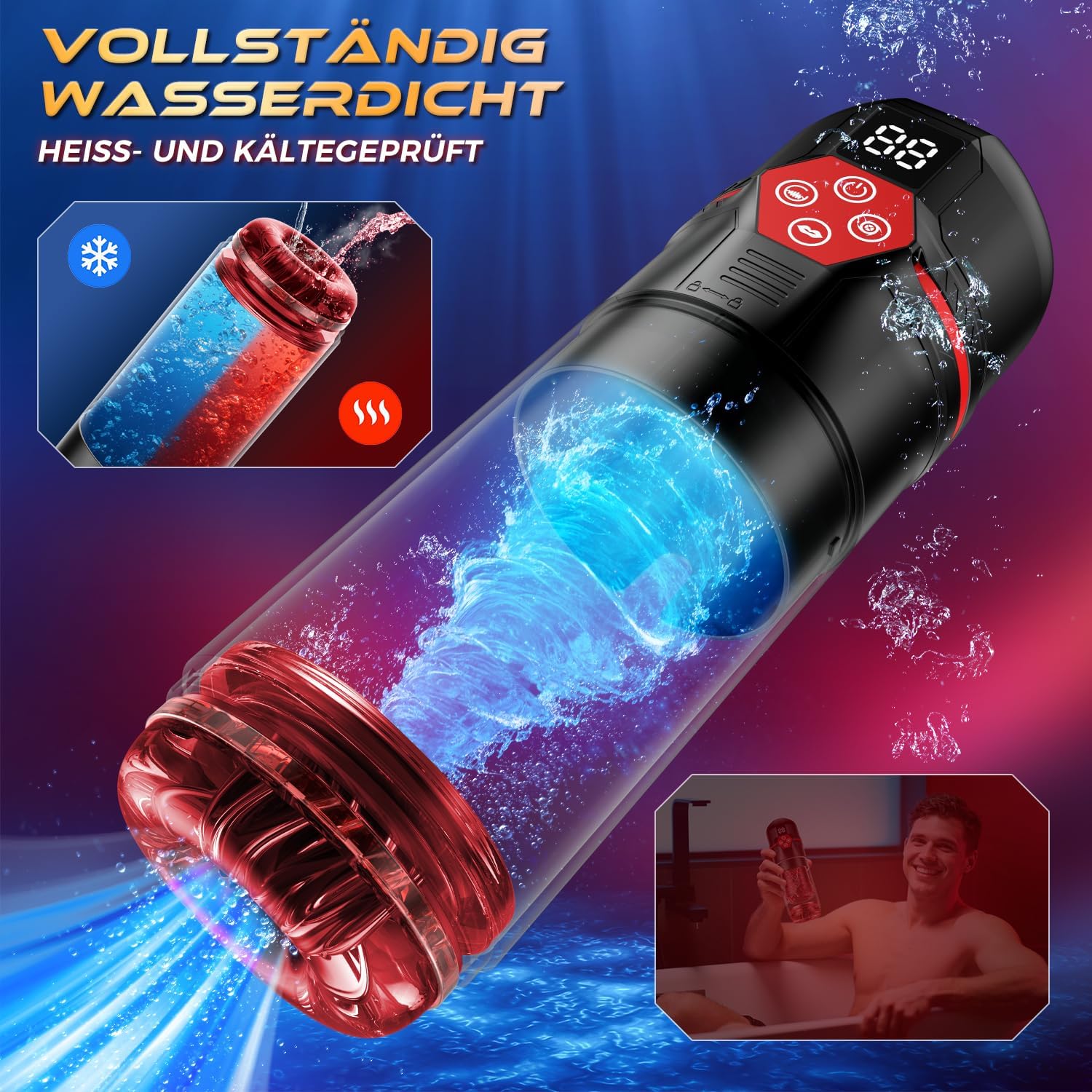 【100% Wasserdichter Sex Spielzeug für Männer extrem】Mit diesem elektrische cup-masturbatoren können Sie eine 360°-Wassermassage genießen. Geben Sie maximal 40 % des Cup-Volumens kaltes oder heißes Wasser in den männer mastubratoren. Die pocket pussy in kaltem Wasser kann die Empfindlichkeit reduzieren und Ihr Vergnügen verlängern, während die sexmaschine für die männer in warmem Wasser Sie entspannen. und Ihr Penis wird im Wasser trainiert, die Ausdauer wird verbessert und Sie erleben eine erfrischende neue Erfahrung.